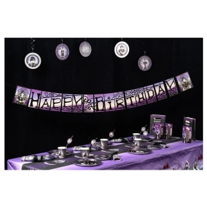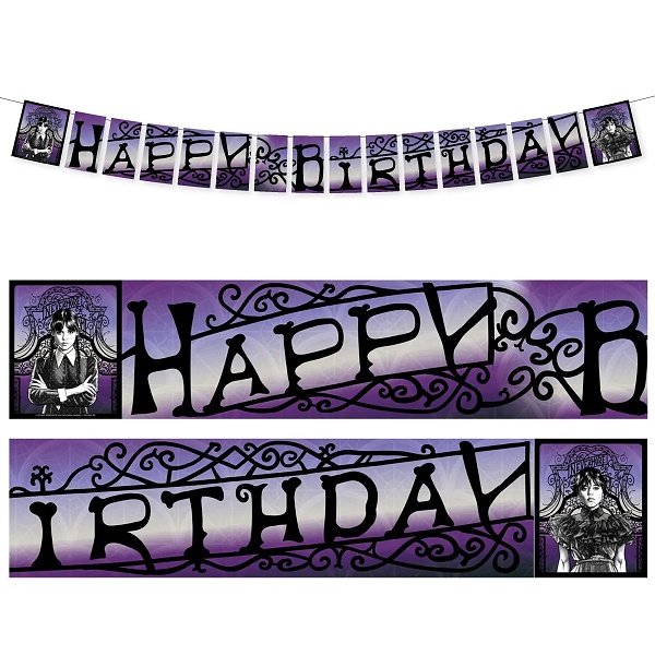 Závěsná narozeninová girlanda Wednesday vám určitě nesmí chybět do výzdoby narozeninové oslavy v tomto tématu.