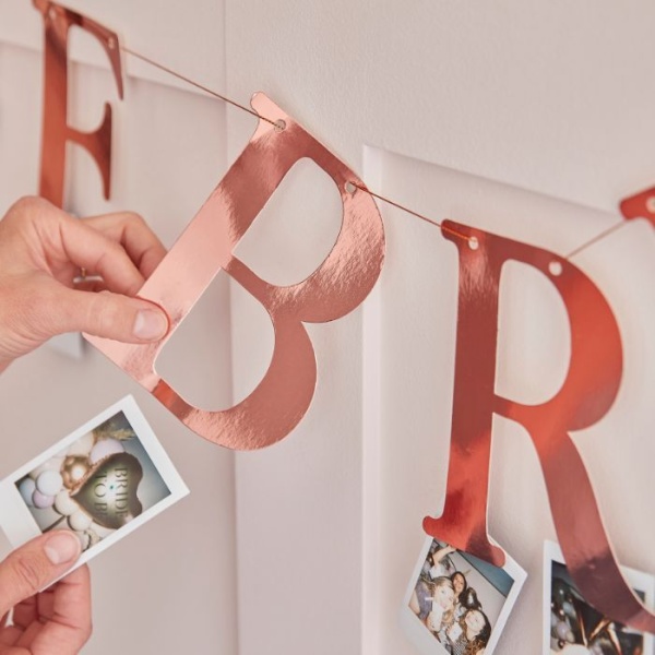 K tomu vám skvěle poslouží tento banner v barvě růžového zlata s nápisem The Bride.