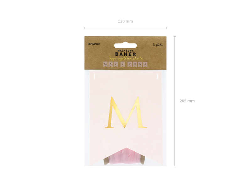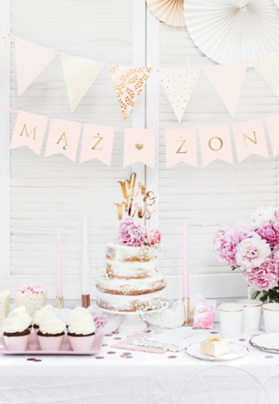 Světle růžový transparent se zlatým nápisem Mąż Żona, udělej si sám, sada obsahuje písmena a cca 2,5 m světle růžové stuhy, rozměry po sestavení: výška cca 15 cm, délka cca 110 cm.