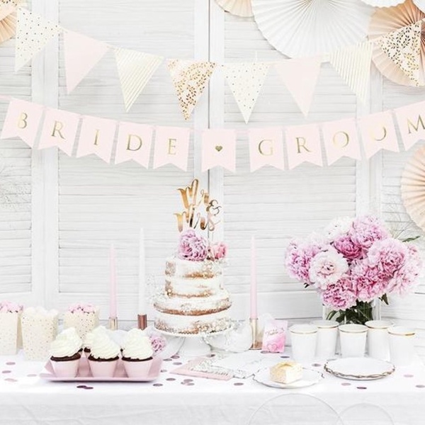 Světle růžový papírový svatební banner se zlatým nápisem Bride-Groom.