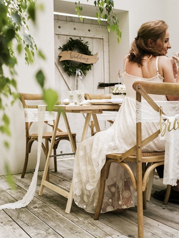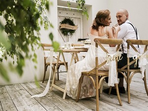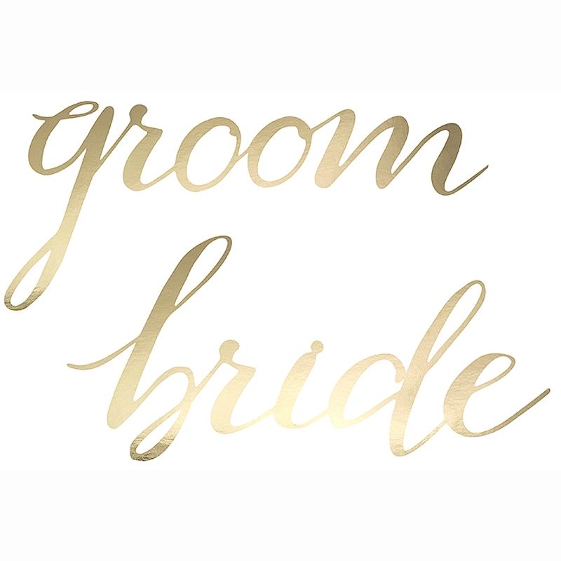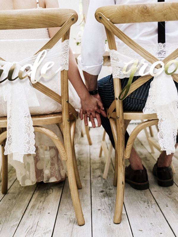 Dekorační zlatý nápis, vhodný pro dekoraci židlí na svatební hostinu. Stylový doplněk, který potěší každého svatebního fotografa.