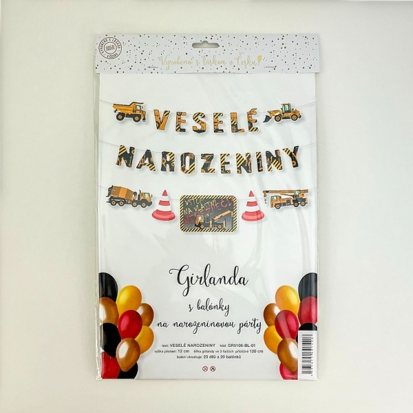 Tato narozeninová girlanda Ze stavby je to pravé, co kluci potřebují. Je s českým nápisem Veselé narozeniny. A co víc, po narozeninách se s některými díly dají vyzdobit třeba dveře do pokoje. Girlanda je k zavěšení ve třech řádcích a je ještě doploněna barevnými latexovými balónky.