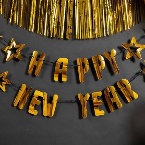 Ozdobte tedy svoji silvestrovskou párty stylově tímto závěsným bannerem se zlatým nápisem Happy New year na černém provázku.