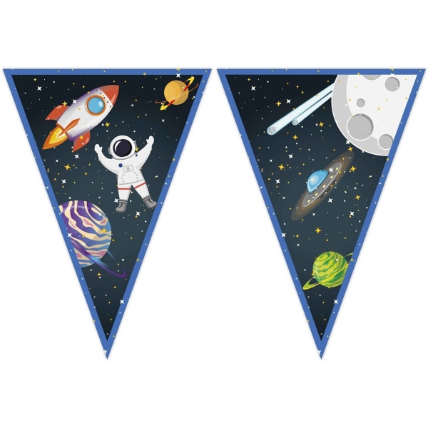 Fantastický vlaječkový banner s potiskerm vesmírných planet, raket a kosmonautů.