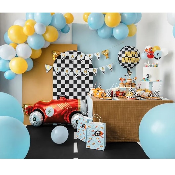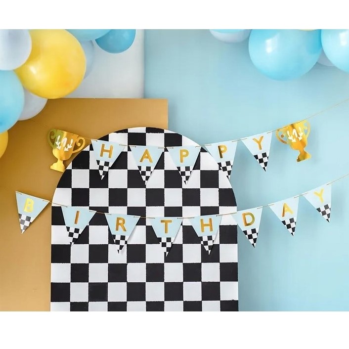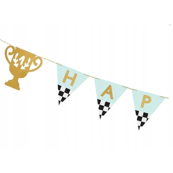 Narozeninová girlanda s vlaječkami a vítěznými poháry s nápisem Happy Birthday pro malé fanoušky závodních aut.
