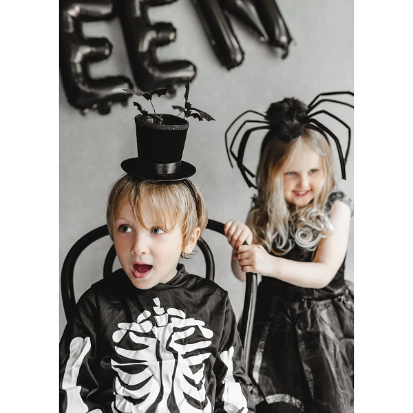 Čelenka na Halloween – černý cylindr s netopýry je originální doplněk, který okamžitě upoutá pozornost na každé halloweenské nebo čarodějnické párty. Díky výraznému designu s černým cylindrem a efektními netopýry se stane nepostradatelnou součástí vašeho kostýmu. Snadné nasazení a pohodlné nošení zaručí, že si užijete večer bez starostí o účes či komfort.