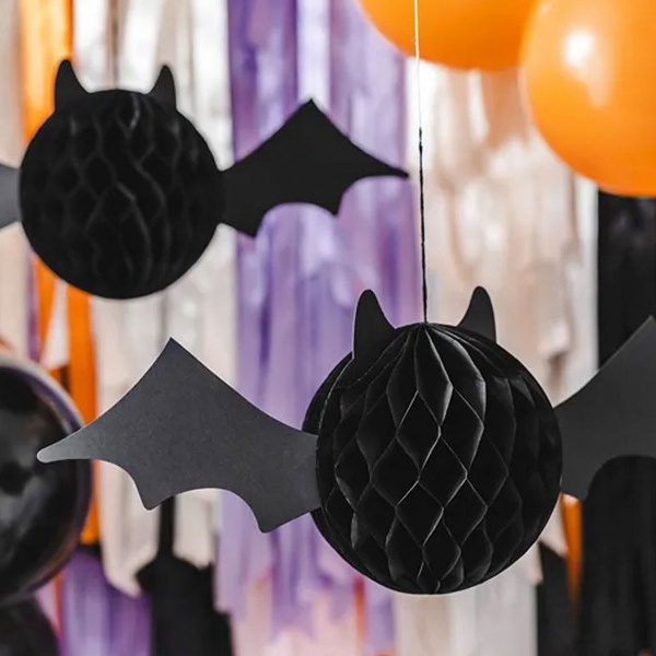 Závěsnou dekoraci tvoří koule z černého voštinového papíru s netopýřími křídly.