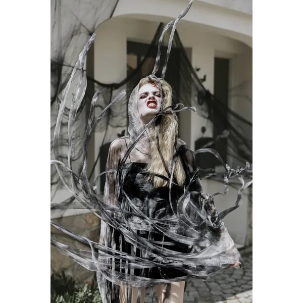 Kostým je v černé a šedé barvě, která dodává outfitu ponurý a strašidelný efekt.
