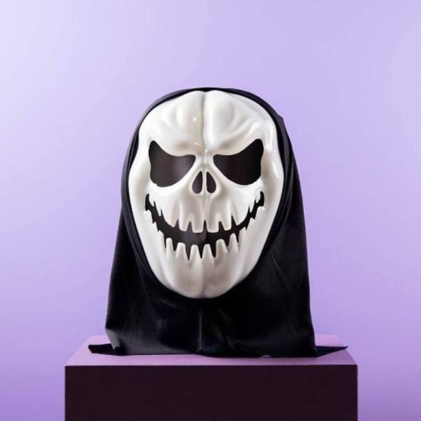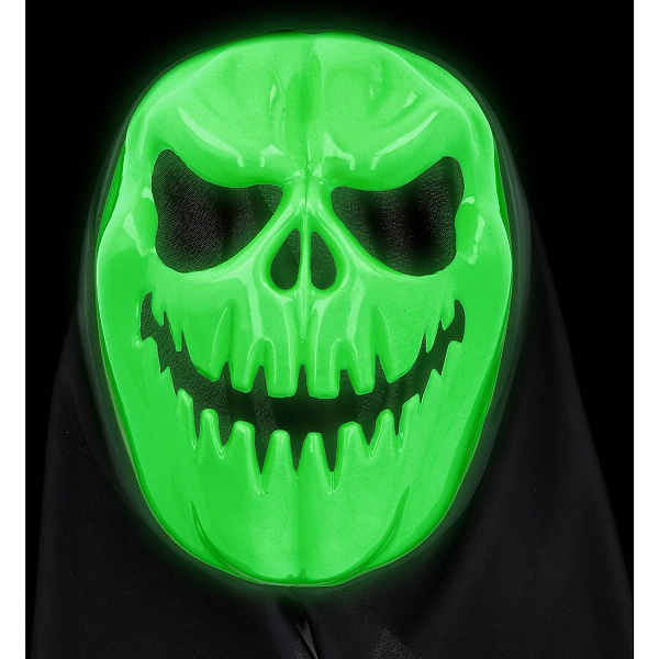 Každý host bude zděšený, když se tato maska objeví ve tmě. Tato halloweenská maska je z jedné strany potištěna zářivým povlakem. Má černou látkovou zadní stranu, takže se maska musí nasadit přes hlavu a zakrývá tak celou hlavu.