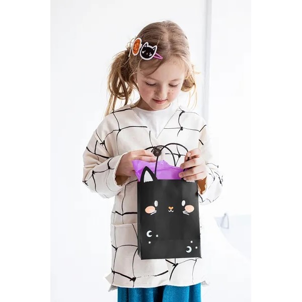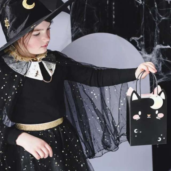 Dárková taška v černé barvě s barevným potiskem kočky a visačkou ve tvaru měsíce.
