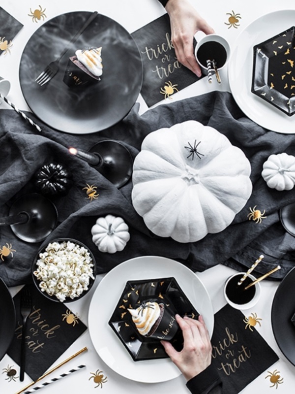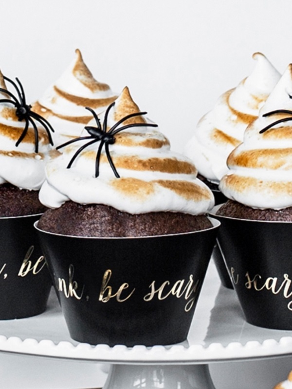 Košíčky z halloweenské designové řady Trick or Treat se zlatým nápisem Eat,drink, be scary!. Děsivě jíst a pít je prostě docela zábava.