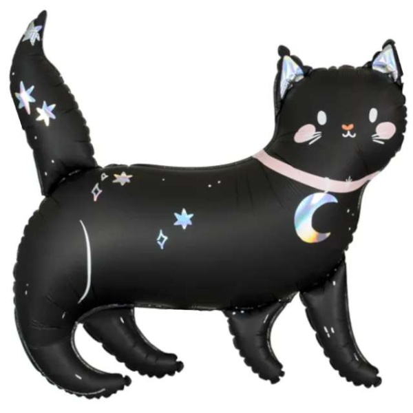 Krásný foliový balónek ve tvaru černé kočičky s holografickým potiskem hvězd, měsíce a růžového obojku.