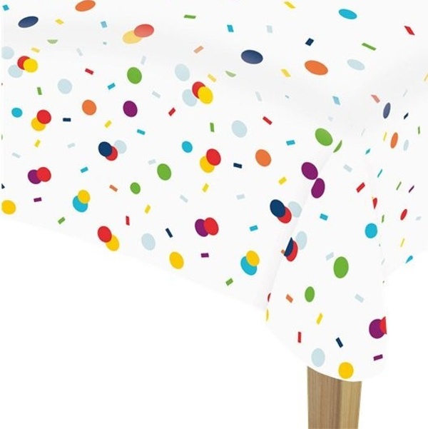 Ubrus je bílé barvy a po stranách jej zdobí barevné konfety.