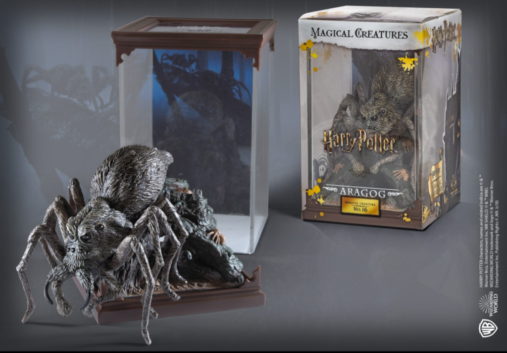 - Detailně zpracovaná a ručně malovaná soška vůdce akromantulí v Zapovězeném lese ve filmu Harry Potter a Tajemná komnata. Tato figurka je součástí kolekce Magical Creatures z dílny Noble Collection. Soška má rozměry přibližně 11 cm na šířku a 17 cm na výšku. Obsah vitríny lze vyjmout. Oficiální licence Harry Potter Výrobce: britská společnost Noble Collection