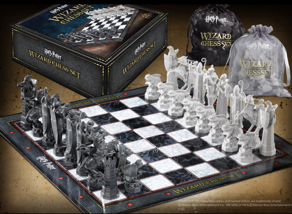 - Kouzelnické šachy, se kterými jste se mohli setkat hned v prvním díle Harry Potter a Kámen mudrců. Jedná se o set hrací desky s plastovými figurkami. Velikost figurek od 5 do 12 centimetrů. Rozměr hrací desky 47×47 cm. Hmotnost setu: 1,7 kg Oficiální licence Harry Potter Výrobce: britská společnost Noble Collection
