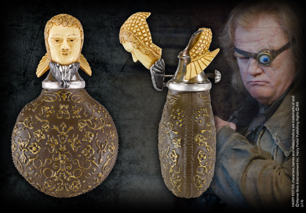- Replika placatky bystrozora pošuka Moodyho, kterou znáte z filmu Harry Potter a Ohnivý pohár. Lahev se otevírá tlačítkem a je detailně zdobená. Výska cca 16 cm. Oficiálně licencováno.