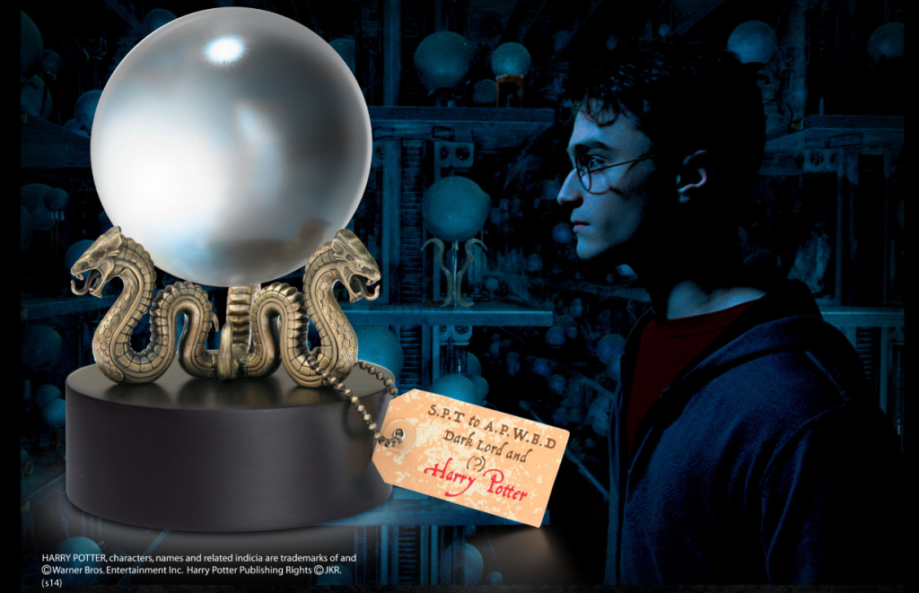 - Autentická replika Harryho věštby z Ministerstva Kouzel – oddělení záhad. Skleněná koule je vsazena mezi tři bronzové bazilišky na podtavci. Výška 13 cm. Oficiální licence Harry Potter Výrobce: britská společnost Noble Collection