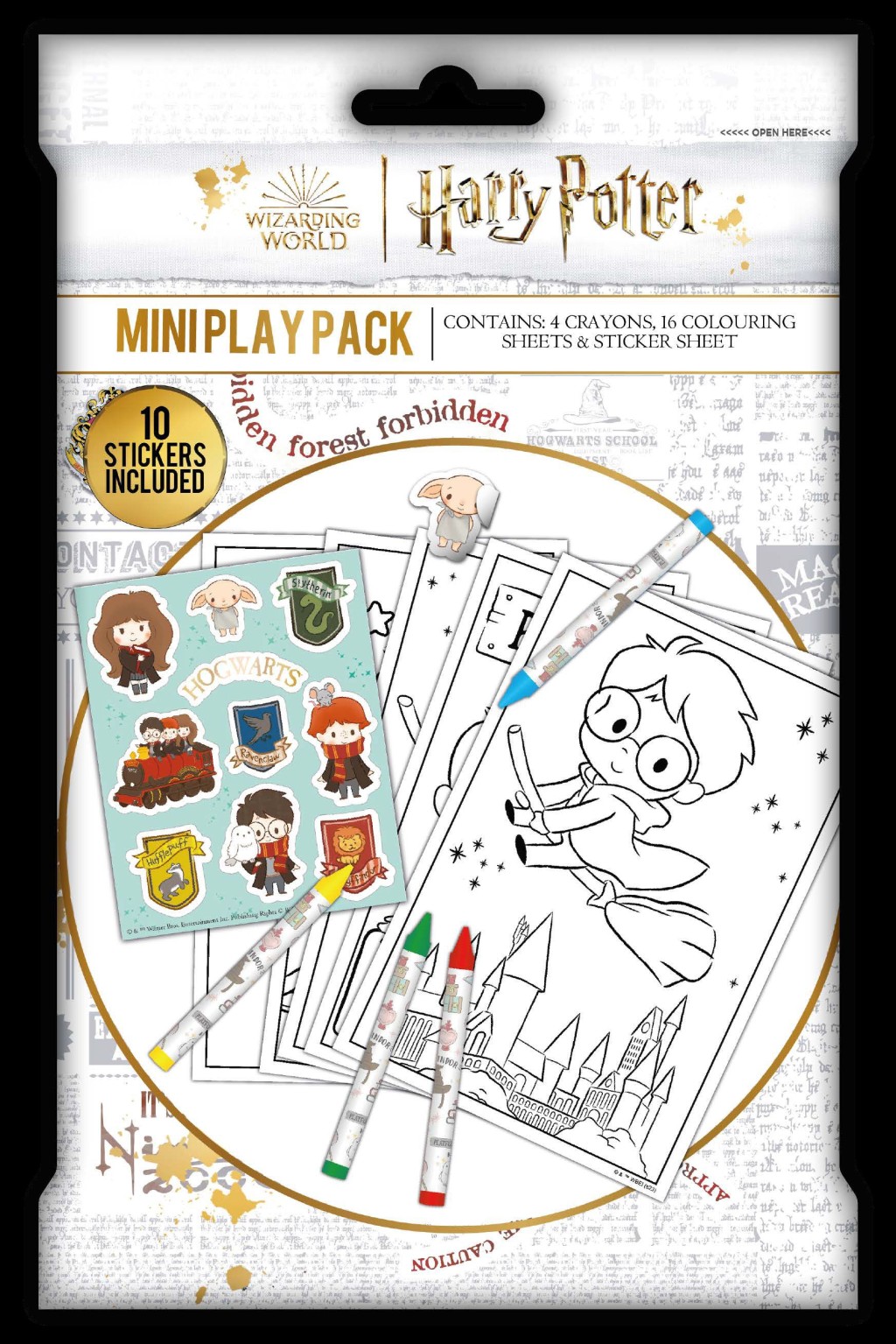 Mini malířská sada Harryho Pottera obsahuje 16 omalovánek, 4 pastelky různých barev a 10 samolepek.