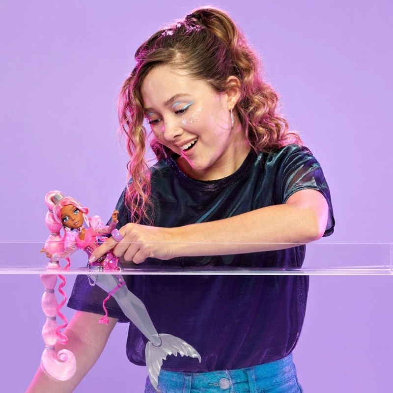 Panenka Mermaze Mermaidz™ má jedinečný „vytvarovaný ocas“, který po ponoření do vody mění barvy. Tvar ocasu plně odráží rysy postavy. Dokonale podtrhuje její styl. Má kloubové body na krku, ramenou, loktech, zápěstí, trupu, pasu a ocasu pro více poloh. Ocas také funguje jako stojan; když ji ohnete o 90 stupňů, panenka může stát sama