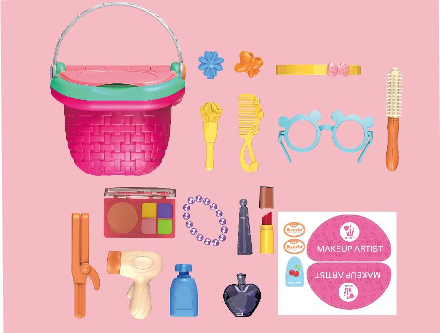- Košík plný make-up doplňků. Košík obsahuje 18 kusů doplňků jako je např. parfém, rtěnka, stíny, fén, doplňky do vlasů.