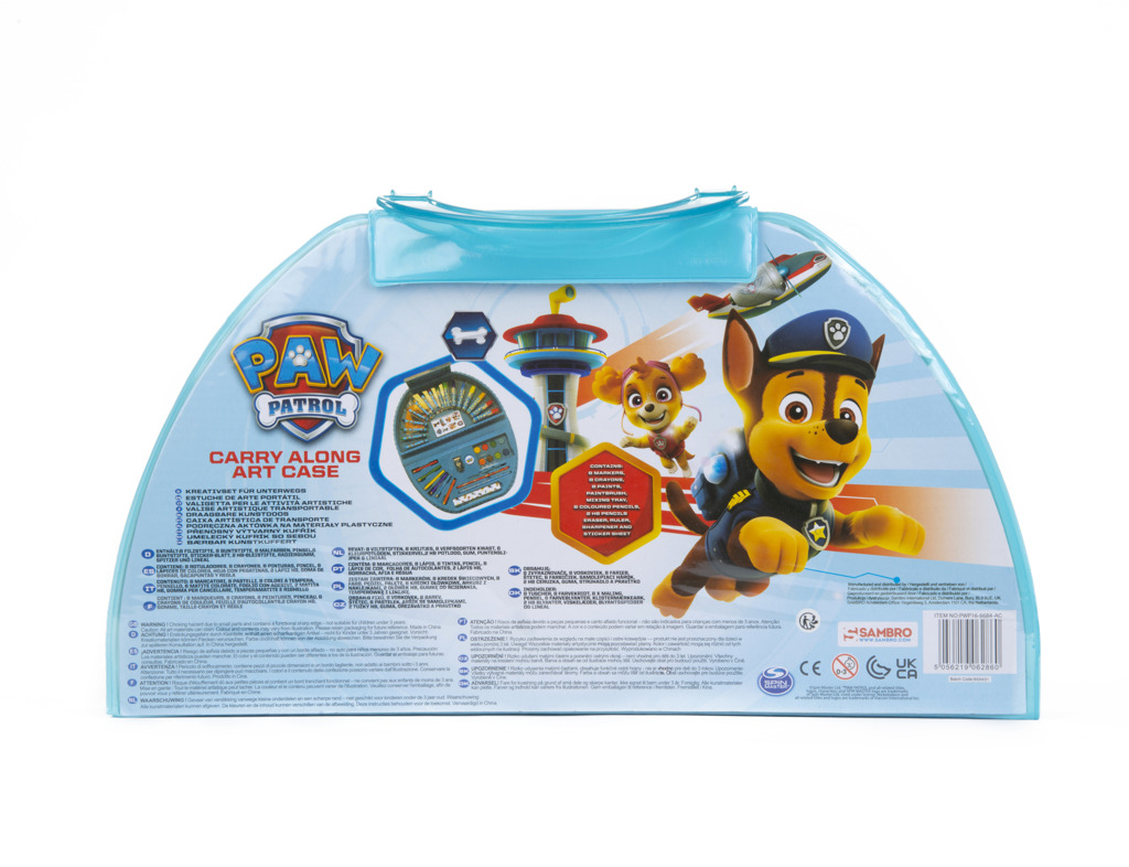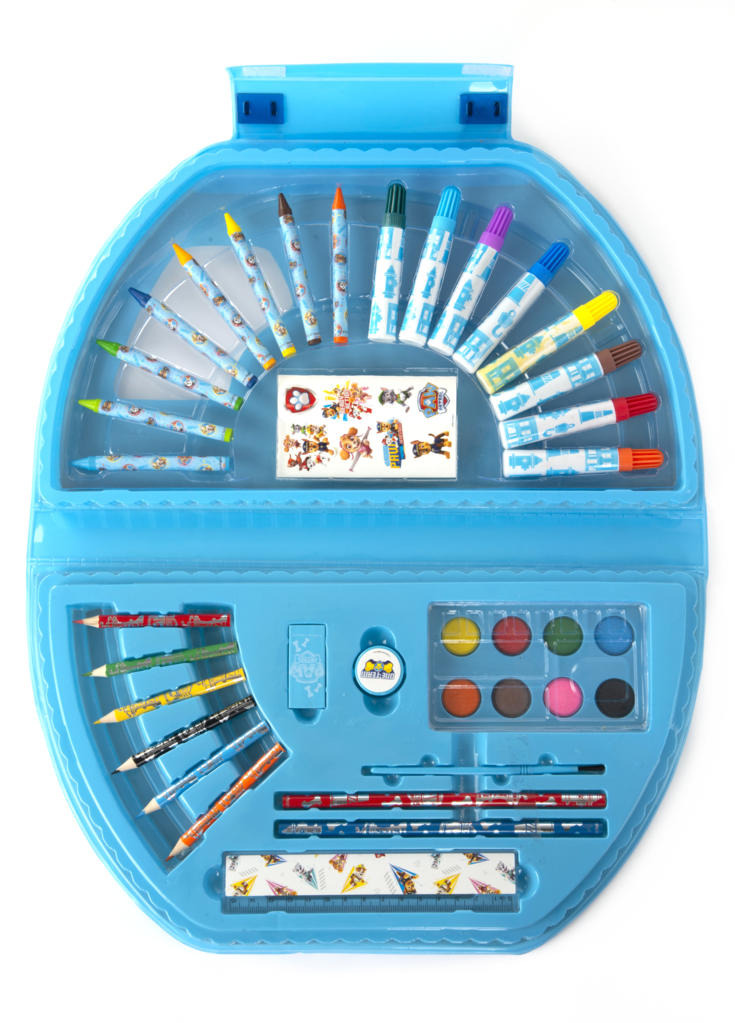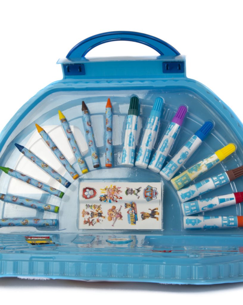 Kufřík malovací kovový Tlapková Patrola – skvělý set pro kreativní zábavu uspokojí všechny malé fandy Tlapkové Patroly. Obsahuje fixy, voskovky, pastelky, vodovky, obyčejné tužky, pravítko, gumu, ořezávátko, štětec a samolepky.