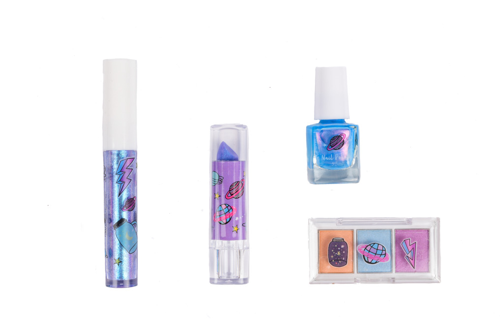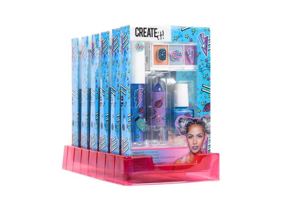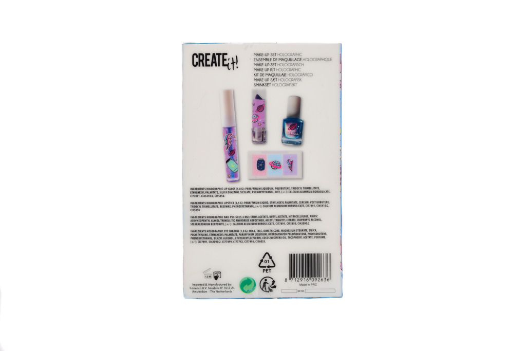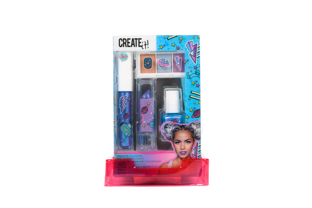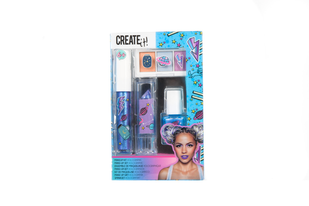 - Make up sada holografická obsahuje oční stíny, lesk na rty, rtěnku a lak na nehty – vše v holografických barvách.