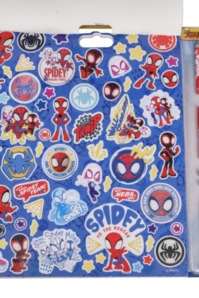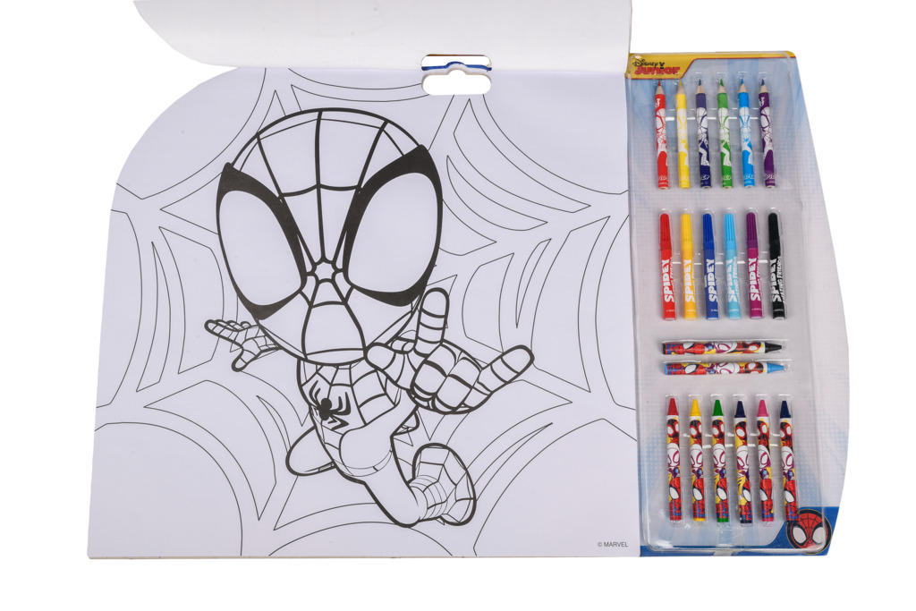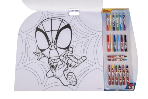 - Malovací sada 5v1 Spidy obsahuje – 8 ks voskovek, 6 ks fixů, 6 ks pastelek, aršík s 84 samolepkami Spidy, 15 šablon a čisté papíry.