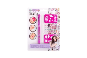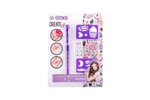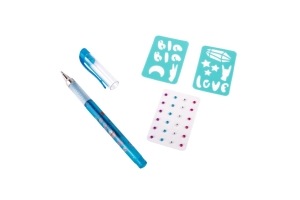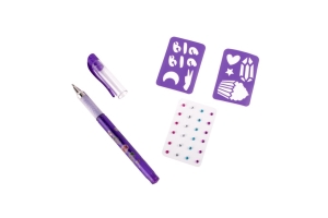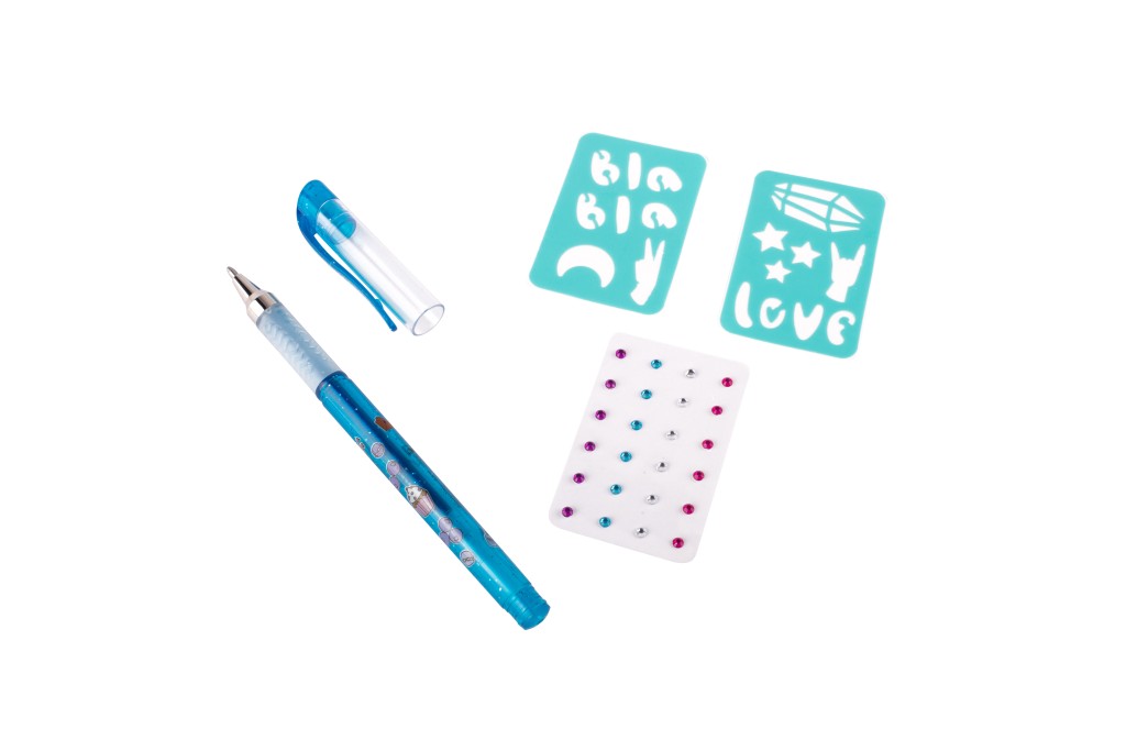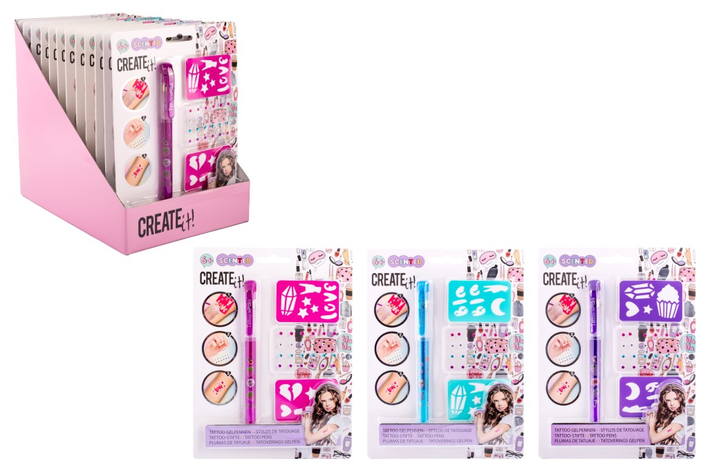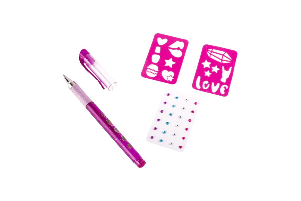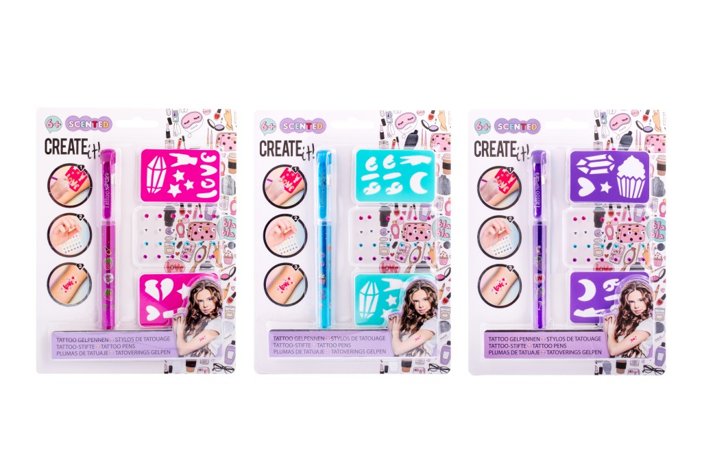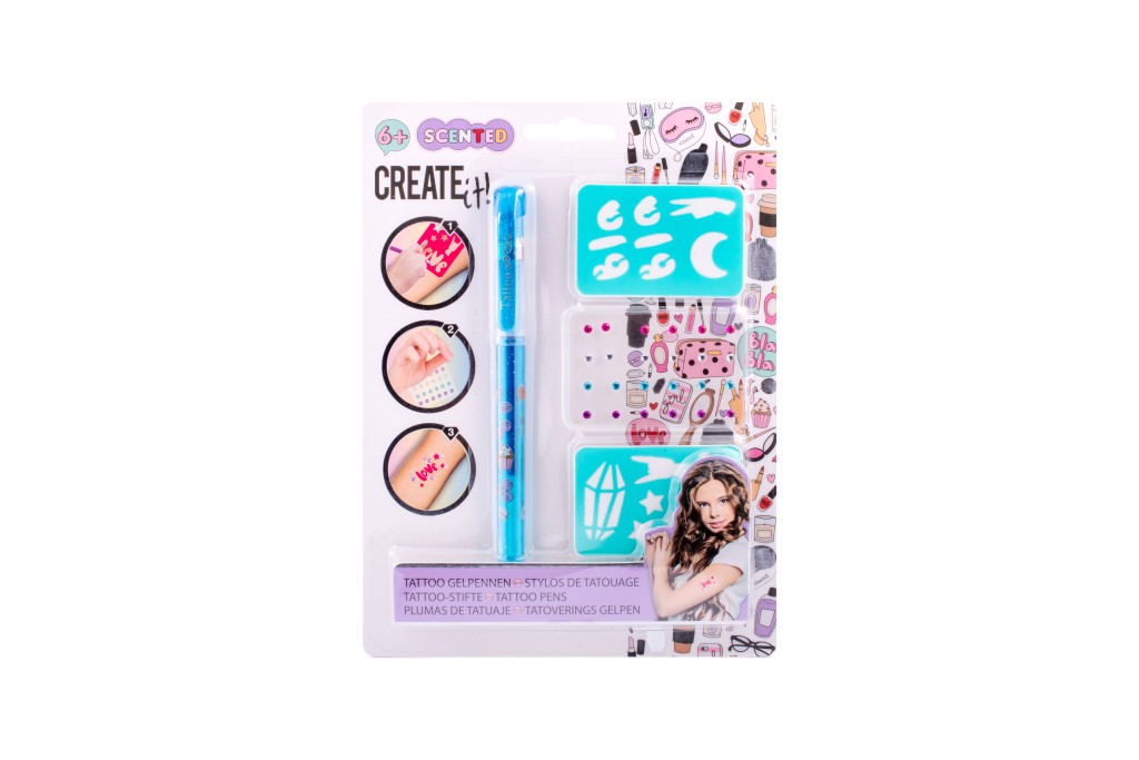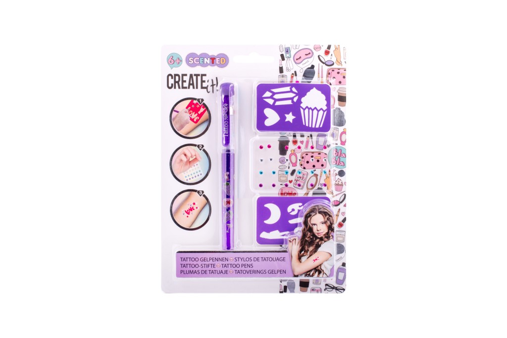 - Tetovací sada s voňavým gelovým perem – sada obsahuje gelové, voňavé tetovací pero – 3 různé barvy, samolepící třpytivé kamínky a dva kusy šablon.