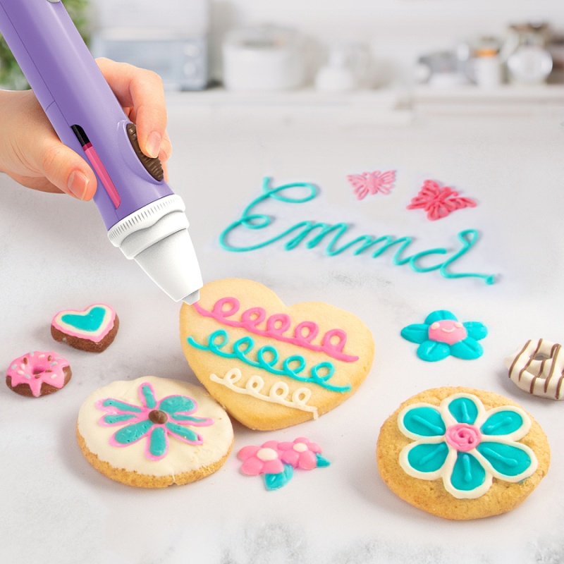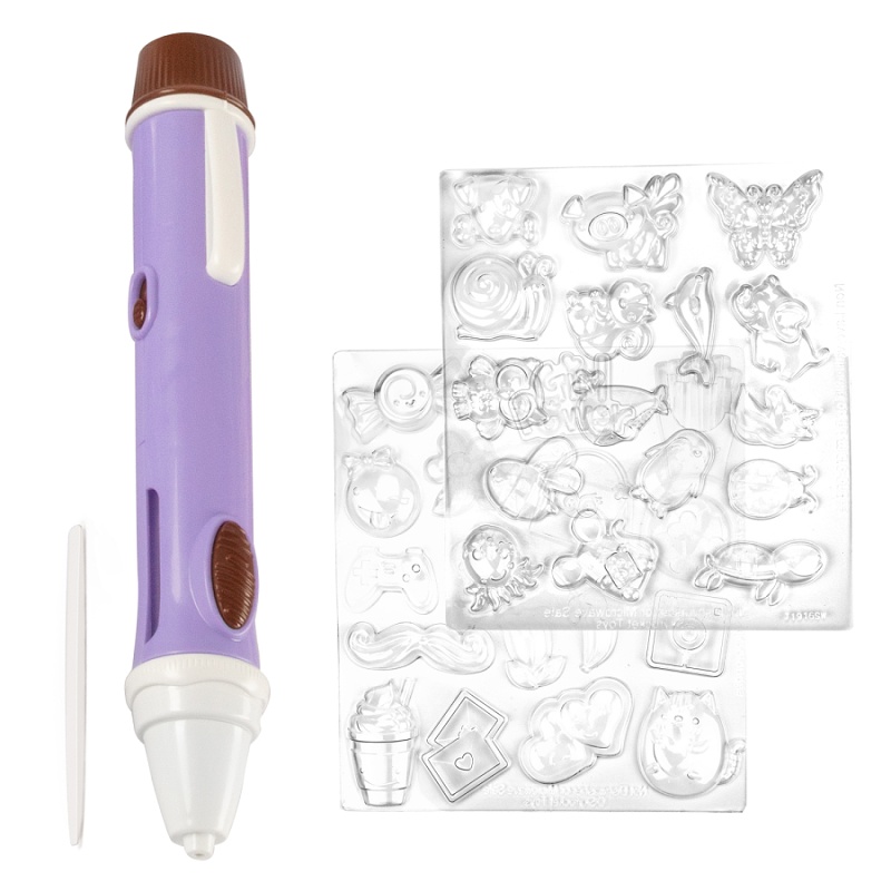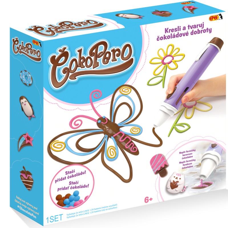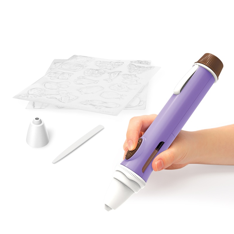 Vytvořte unikátním způsobem lahodné dekorace ještě lépe než kdy dříve. Nový design čokoládového pera je vhodný pro děti, po naplnění pera čokoládou a pouhým stisknutím tlačítka můžete psát slova, kreslit jedinečné kresby nebo použít formičky k vytváření duhy, srdíček a dalších zábavných tvarů. Dětští kuchaři si zamilují přidání čokoládových detailů na ovoce, sušenky, košíčky, muffiny nebo cokoli, po čem jejich sladké srdce touží. Jejich kutilské výtvory během několika minut magicky ztuhnou a budou perfektním dárkem pro vaše přátele a rodinu.