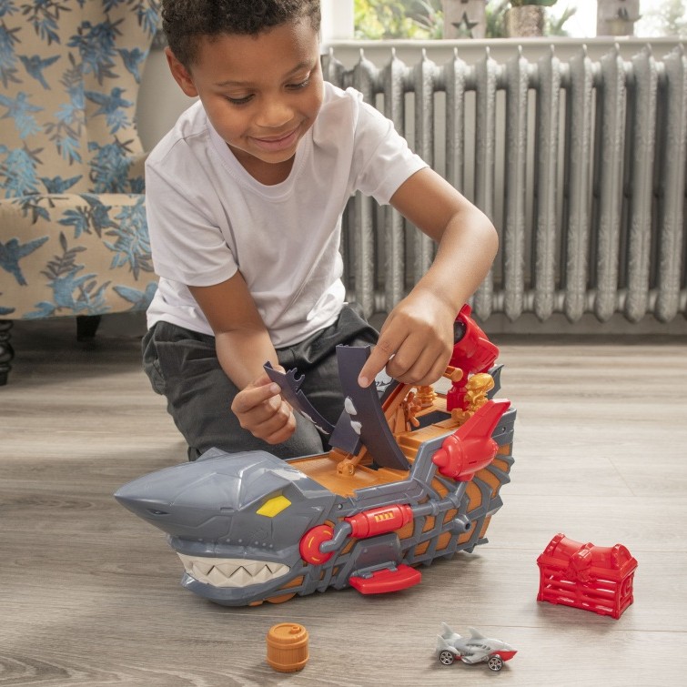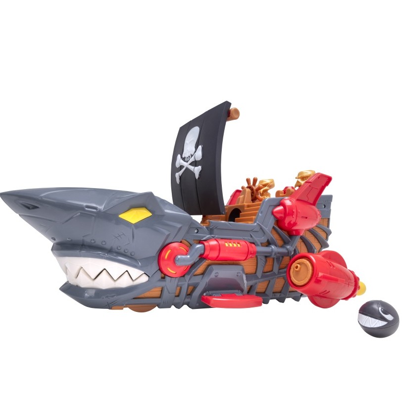Sjeďte s autíčkem po rampě a zatlačte loď vpřed, abyste vypustili autíčko z čelistí. Loď je vybavená dělem, které můžete nabít dělovou koulí nebo hlavní a následně zatáhnout za páčku, abyste vystřelili. To bude skvělá zábava pro všechny malé piráty!