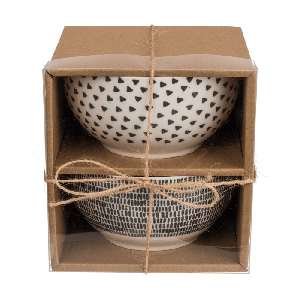Misky jsou černobílé barvy, uložené v kraftové krabičce, převázané přírodním provázkem.