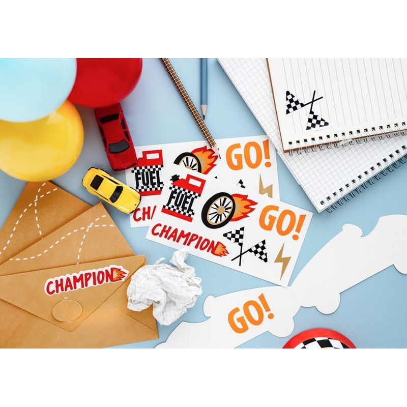 Tyto samolepky jsou ideální doplněk zábavy pro tématickou párty závodní Formule. Vyznačují se různými podmanivými vzory, od hořícího kola po šachovnicovou vlajku, v řadě zářivých barev.