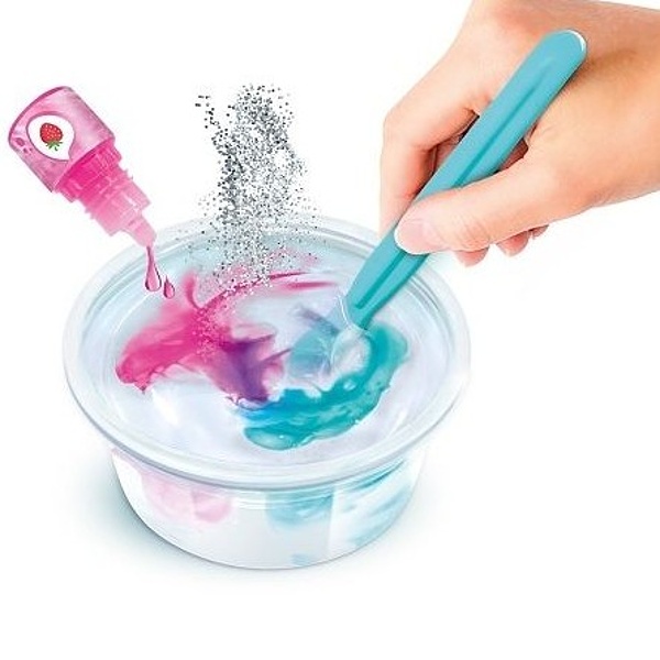 Baleníé obsahuje: žehlící prkno, žehlička s UV světlem, míchátko, průhledný sliz v krabičce, průhledný sliz v sáčku, 3 barvy s vůní vanilky, ananasu a jahod a 2 sáčky třpytek.
