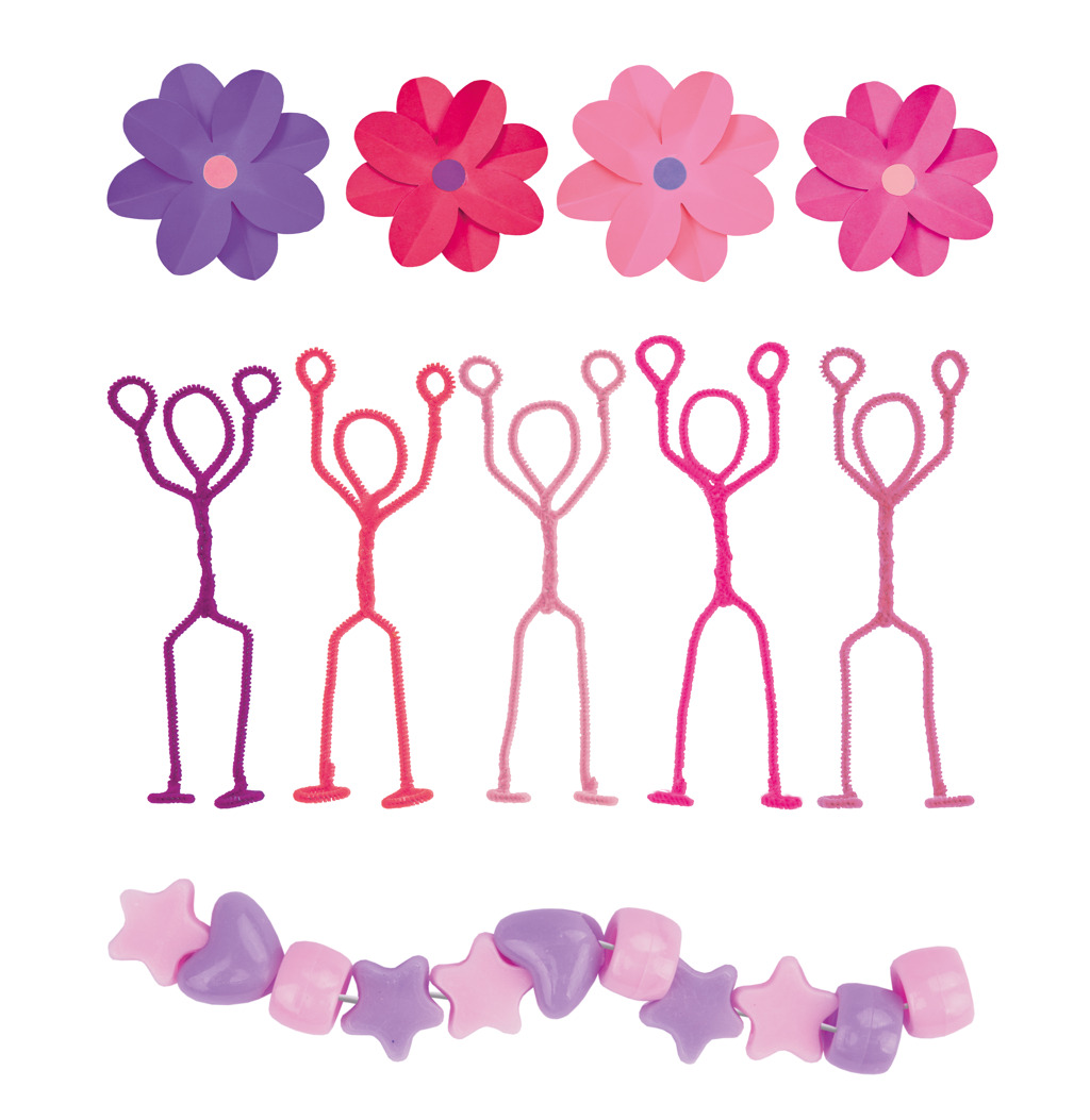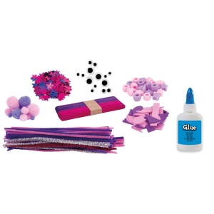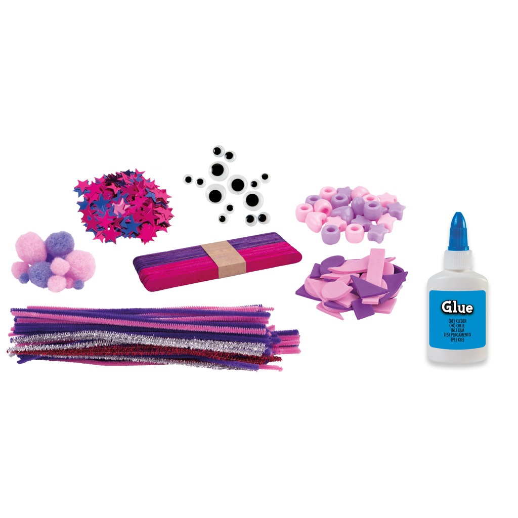 Buď kreativní a vytvoř si květy z papíru, domeček z nanukových paliček, zvířátka a další zábavné postavičky. Balení obsahuje pracovní papír, paličky na nanuky, pěnové figurky, hvězdy, bambule, korálky, očka, lepidlo, třpytivé lepidlo a třpytivé paličky. Dodávané v přenosné krabici s množstvím nápadů.
