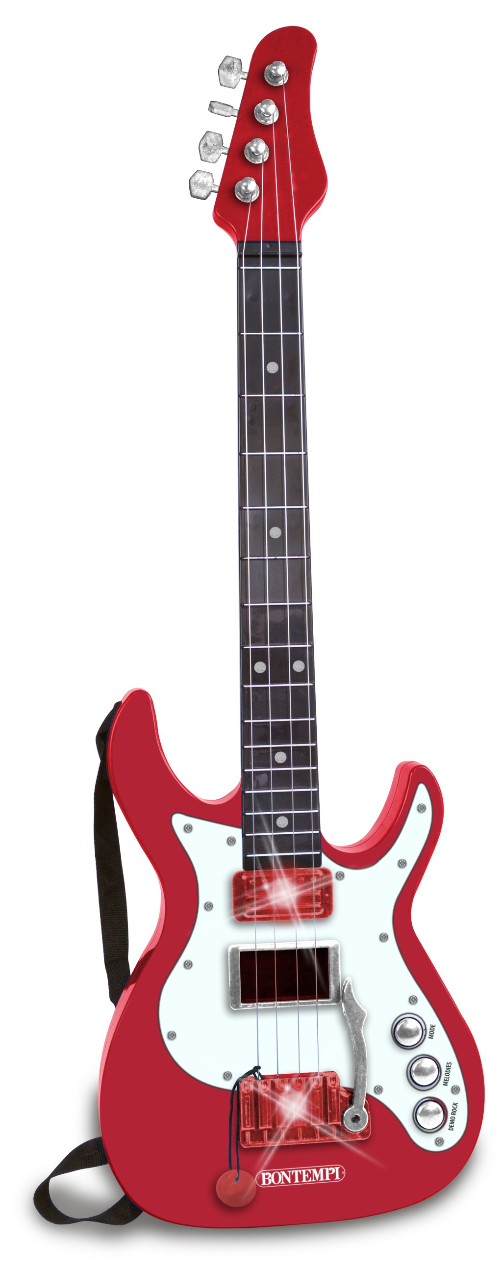 - Elektrická roková kytara – má 4 kovové struny. Lze hrát na jakoukoliv z nich, opakovaným klepáním prsty na alespoň 2 akordy . Hraje demo písničky, 3 režimy, 12 demorokových zvuků, 13 melodií, světelné efekty, ramenní popruh. Nápájení 3× R6/AA , Baterie nejsou součástí balení.