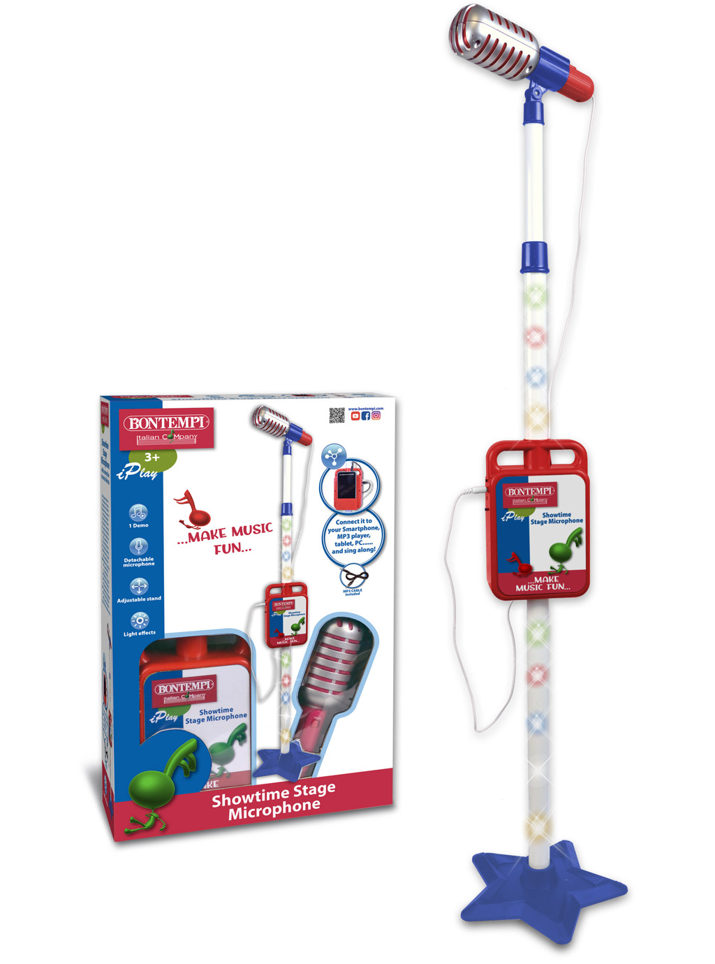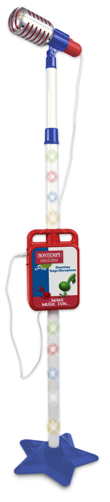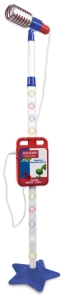 - Stojací mikrofon se světlem a zvukem. Nastavitelný, zástrčka pro mikrofon, kompatabilní s mobilním telefonem, konektor pro externí zařízení (tablet, mp3 atd.). Provoz na baterie 3 R6/AA 1,5 V. Rozměy 21×21×120 cm.