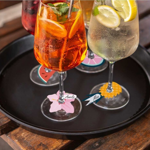 Rozlišovače jsou navrženy tak, aby se snadno připevňovaly na okraj skleničky pomocí malého otvoru a dírky na druhém konci rozlišovače. Tento design zajišťuje pevné a bezpečné uchycení, aby se rozlišovač neodlepil během používání.