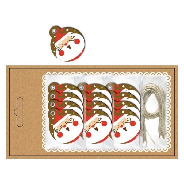 Vánoční jmenovky na dárky jsou kulatého tvaru s obrázkem Santy a očkem v horní části pro provlečení provázku, který je součástí balení.