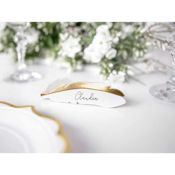 Jmenovky ve tvaru peříčka jsou v barvě bílozlaté.