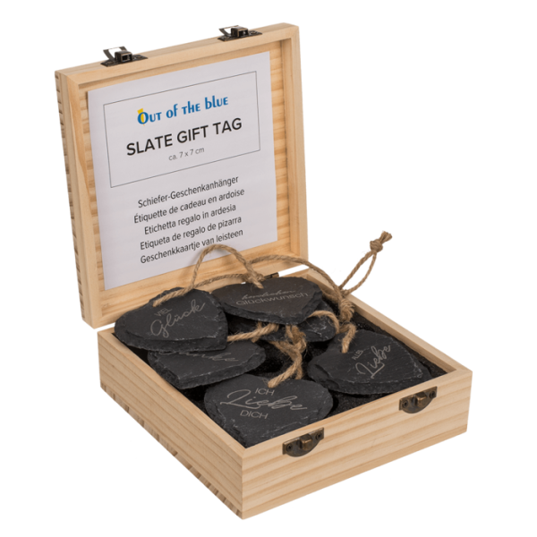 Břidlicové dárkové srdíčko s různými nápisy, zavěšené na přírodním motouzu.