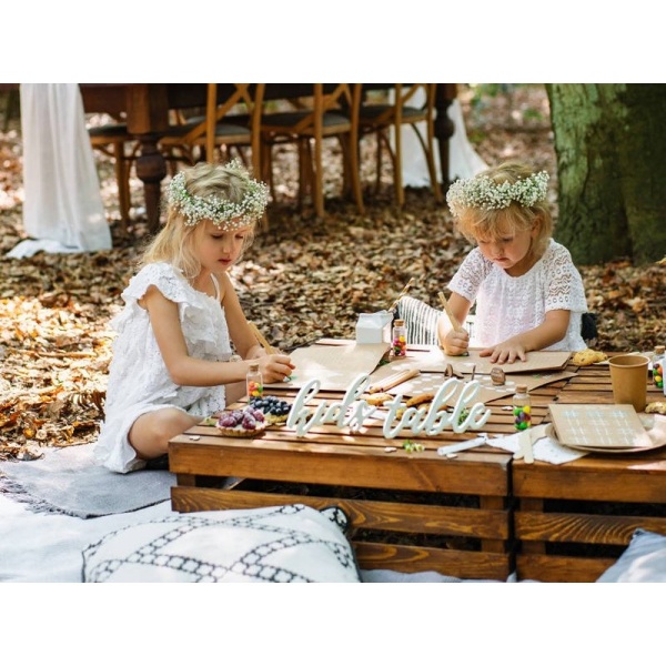 Nápis dětský stůl je vyrobený ze dřeva v bílé barvě.