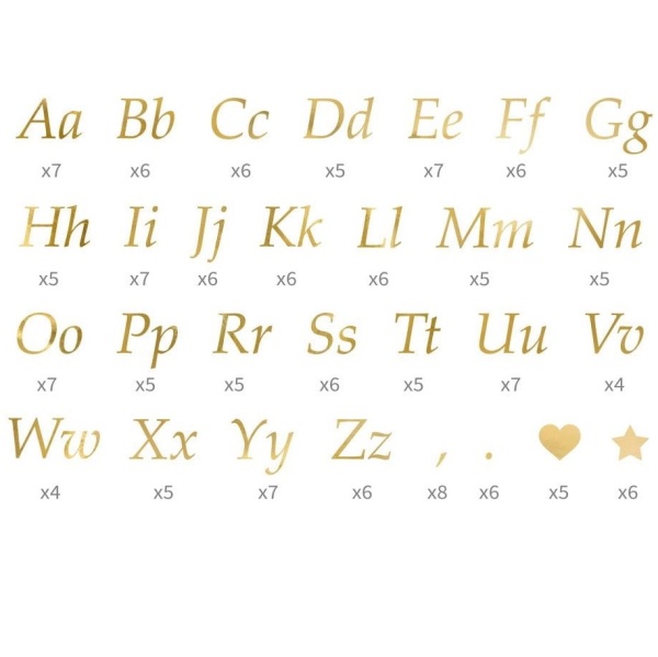 Sada obsahuje 5 listů se zlatými metalickými nálepkami obsahuje 143 písmen (7 písmen A, E, I, O, U, Y, 6 písmen B, C, F, J, K, L, S, Z, 5 písmen D , G, H, M, N, P, R, T, X a 4 písmena W, V) a 28 znaků (5 srdcí, 8 čárek, 6 teček, 6