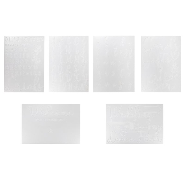 Sada šablon svatebních nápisů obsahuje 6 ks čirých akrylových listů s různými písmeny, čísly a anglickými texty, která můžete použít. Obsahují slova např. Vítejte na svatbě, Taneční parket, Nápoje Dárky, Bar, Láska, skriptová písma, velká písmena a interpunkční znaménka, čísla.