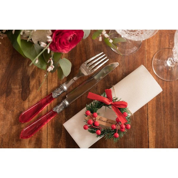 Dekorační jmenovky Věneček s červenými bobulemi a červenou mašličkou.