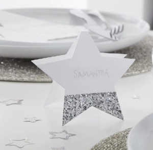 Jmenovky ve tvaru bílé hvězdy se stříbrnými glitry