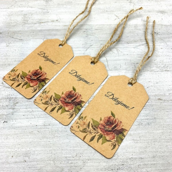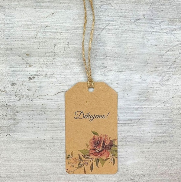 Visačka s potiskem růží a s textem Děkujeme a potiskem motivu je vyrobena z kraftového papíru vyšší gramáže.