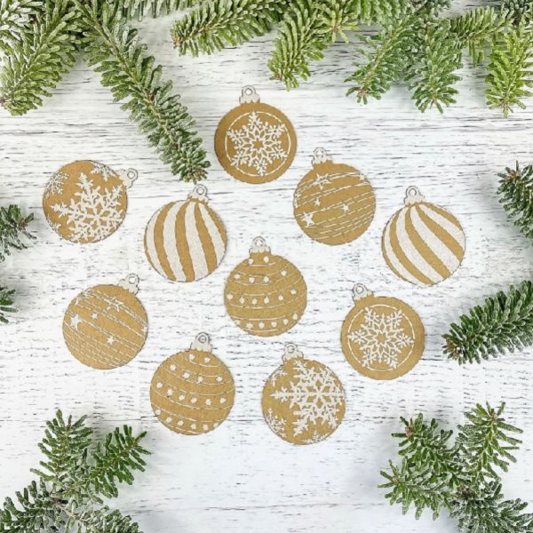 Vánoční kraftové jmenovky na dárky jsou papírové, kulatého tvaru v podobě vánočních ozdob a očkem v horní části pro provlečení provázku, který je součástí balení.