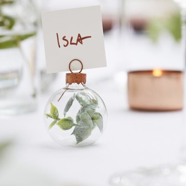 Skleněné koule s lístky eukalyptu jsou originální držáky na jmenovky v přírodním stylu.