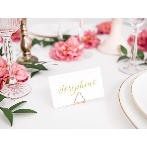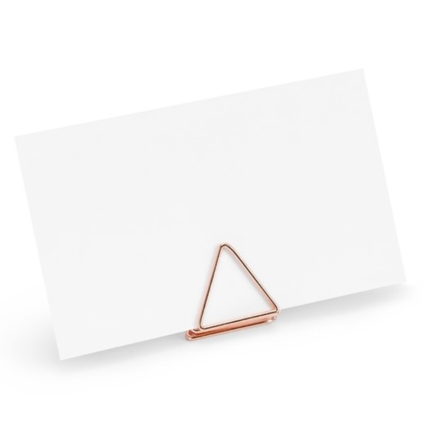 Elegantní stojánky na jmenovky ve tvaru trojúhelníku v barvě růžového zlata na svatební stoly. Jsou velmi snadno použitelné - stačí otevřít okraje trojúhelníků a vložit kartičku se jménem. Díky kovu jsou velmi stabilní a vypadají decentně na svatební tabuli.