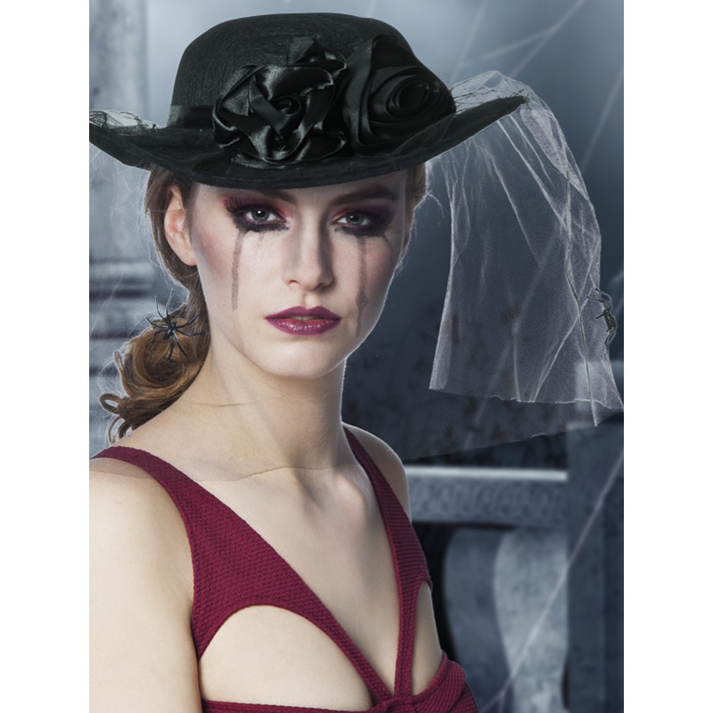 Klobouk vypadá velmi originálně. V jeho přední části je zdobený černými květy a závojem se šesti pavoučky.